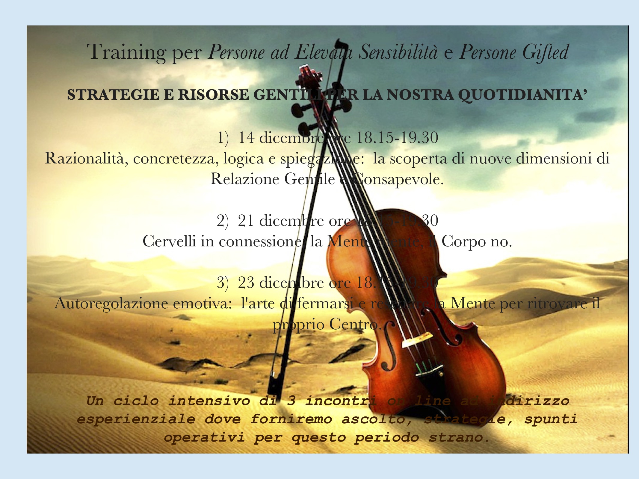 Un ciclo intensivo di 3 incontri on line da lunedì 14 ore 18,30 ad indirizzo esperienziale dove forniremo ascolto, strategie, spunti operativi per questo periodo strano.